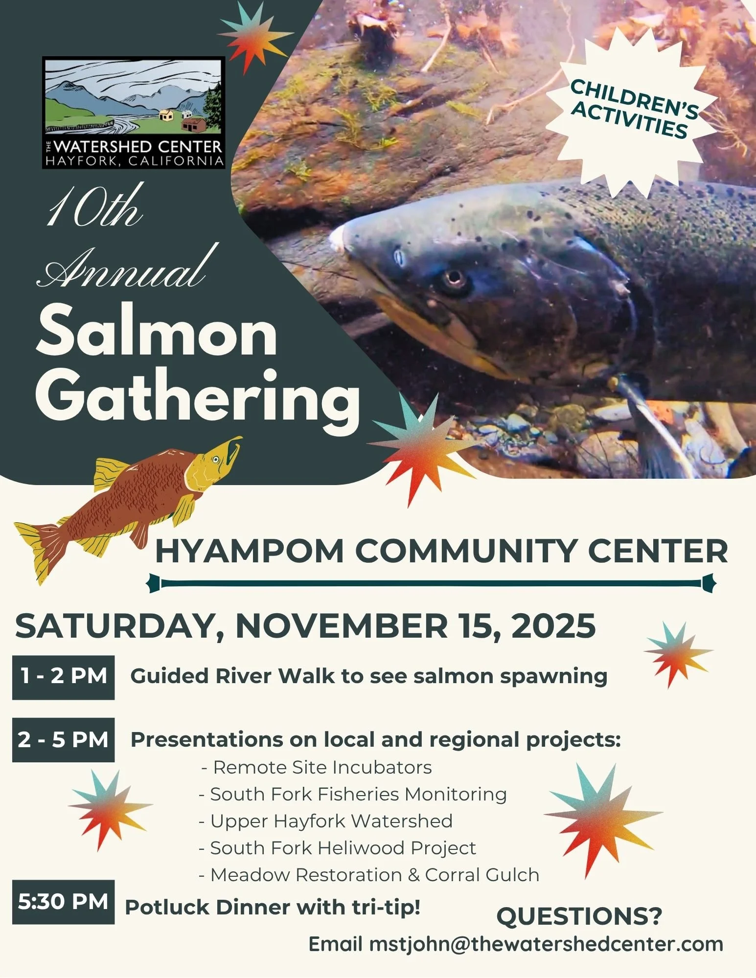 Come one come all to the Hyampom Community Hall at 1:00 PM on Saturday November 15th for the 10th Annual Salmon Gathering Day! We will stroll along the South Fork Trinity River to view salmon spawning in beautiful autumnal Hyampom, then return to the Hall for hands-on children's activities and engaging presentations on current Watershed Center work. We'll enjoy a potluck dinner at 5:30 PM and the Watershed Center will be providing tri-tip! Bring a dish, admire fish, and tell your friends. No RSVP needed.