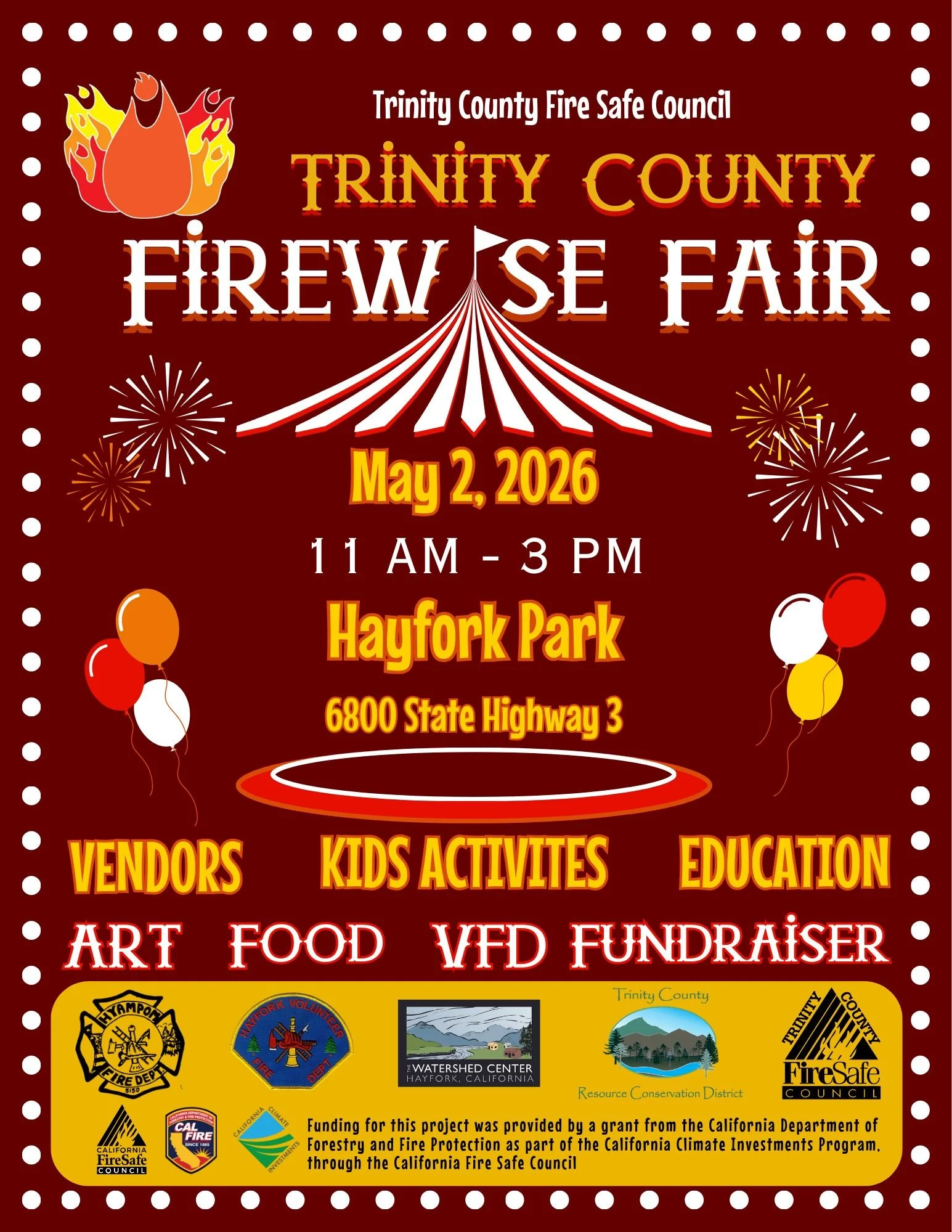 The Trinity County Fire Safe Council is excited to host the third annual Trinity County Firewise Fair in Hayfork Park on Saturday, May 2nd from 11 AM – 3 PM!
