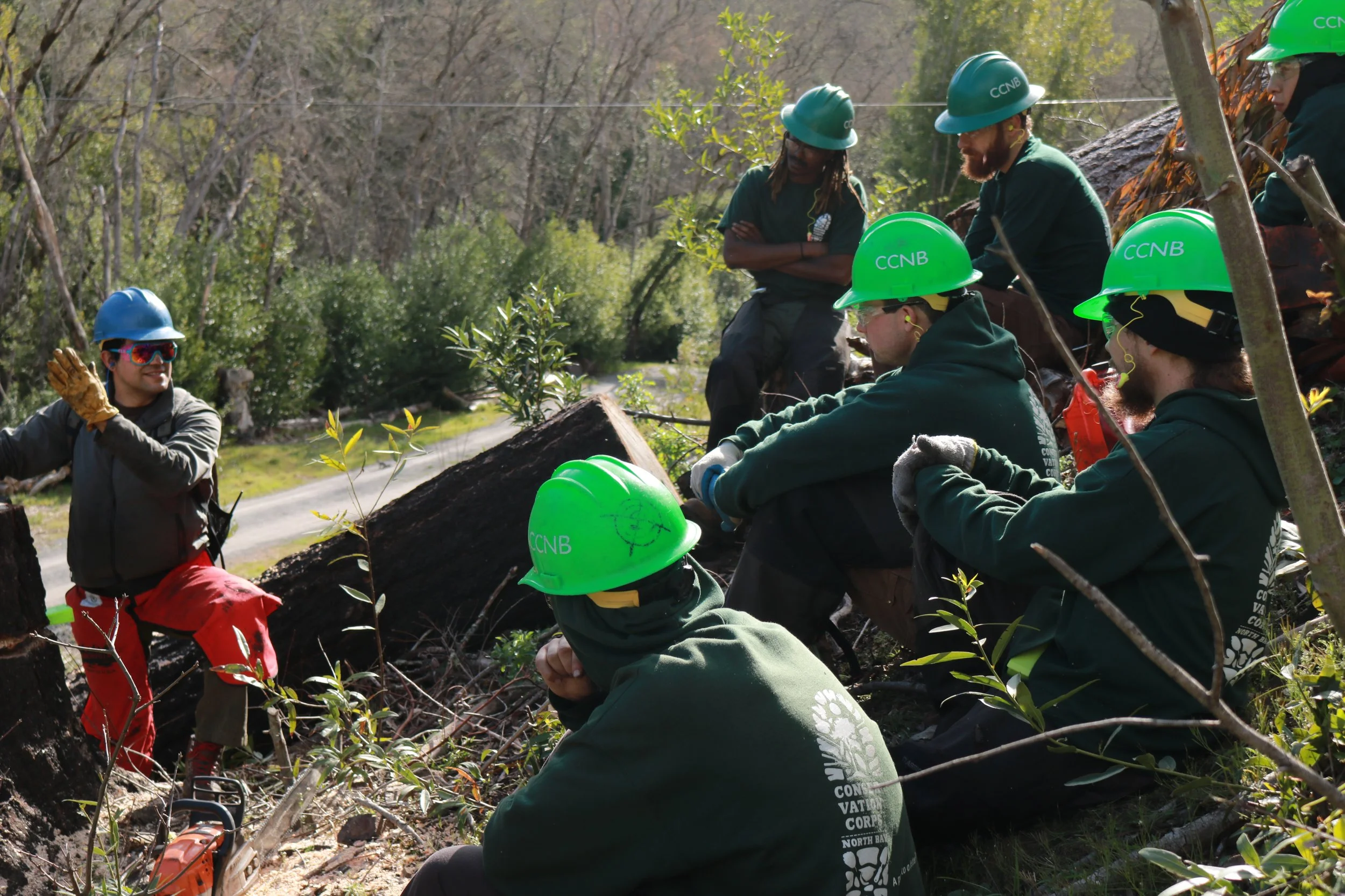 Cascada Ervin, RFFC Priority Populations Program Manager, trains Conservation Corps North Bay corpsmembers in safe tree-felling practices.